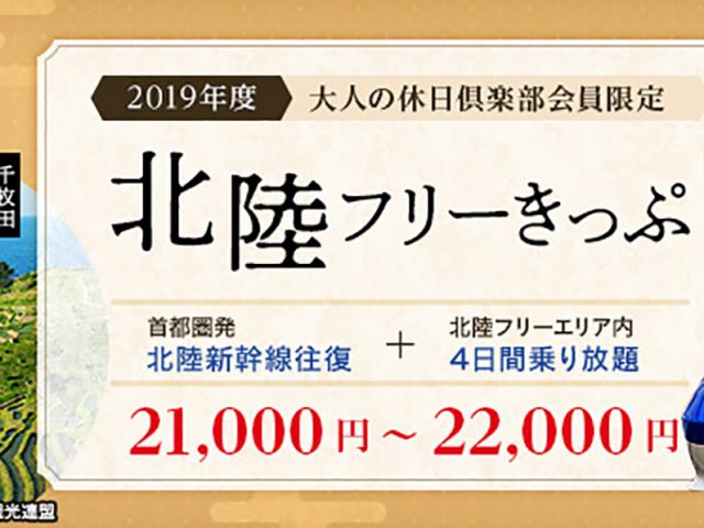 2019.08.02 2019.04.01~2019.11.02 大人の休日倶楽部会員限定 北陸フリーきっぷ ※終了しました 首都圏からの北陸新幹線往復と北陸フリーエリアの乗り放題がセットになったおトクなきっぷです。首都圏の出発駅から北陸フリーエ… 詳しく見る